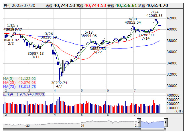 2025年07月31日07時49分 【市況】シカゴ日経平均先物 大取終値比 20円安 (7月30日) 日経平均 <日足> 「株探」多機能チャートよりシカゴ日経225先物 (円建て) 40640 ( -20 ) シカゴ日経225先物 (ドル建て) 40680 ( +20 ) ※( )は大阪取引所終値比 株探ニュース