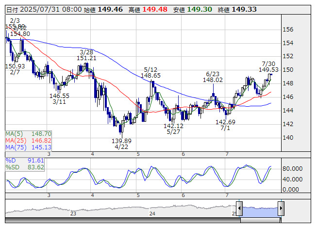 2025年07月31日08時01分 【通貨】外為:1ドル149円32銭前後と大幅なドル高・円安で推移 米ドル/円 <日足> Slowストキャス 「株探」多機能チャートより 31日の外国為替市場のドル円相場は午前8時時点で1ドル=149円32銭前後と、前日午後5時時点に比べ1円25銭の大幅なドル高・円安。ユーロ円は1ユーロ=170円56銭前後と52銭の大幅なユーロ安・円高で推移している。 株探ニュース