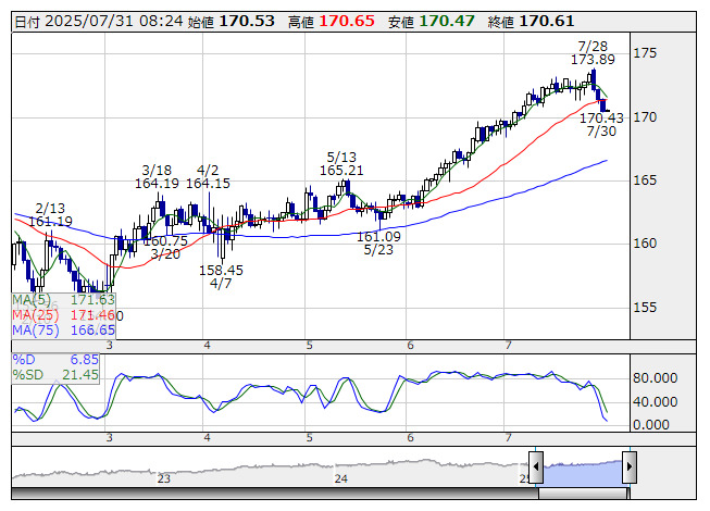 ユーロ/円 <日足> Slowストキャス 「株探」多機能チャートよりユーロ・ドルは、1.0341ドル(2017/01/03)まで下落したが、1.2537ドル(2018/02/18)まで上昇。その後、0.9536(2022/09/28)まで反落したが、2024年にかけて1.1ドル台まで戻している。ユーロ・円は英国民投票で欧州連合(EU)からの離脱が決定し、一時109円57銭(2016/06/24)まで急落。その後137円50銭(2018/2/2)まで買われたあと、長期間伸び悩んだが、日欧金利差の拡大や円安・ドル高の進行を受けて175円16銭(2024/7/10)まで上昇。ただ、その後は上げ渋っている。欧州中央銀行(ECB)のラガルド総裁は経済全般について楽観視していないこと、EUは米国から7500億ドル相当のエネルギーや多額の防衛装備品を購入すること、米国の9月利下げの確率はやや低下していることから、ユーロ買い・円売りがただちに拡大する可能性は低いと予想される。