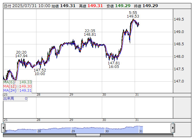 2025年07月31日10時01分 【通貨】外為:1ドル149円30銭前後と大幅なドル高・円安で推移 米ドル/円 <5分足> 「株探」多機能チャートより 31日の外国為替市場のドル円相場は午前10時時点で1ドル=149円30銭前後と、前日午後5時時点に比べ1円23銭の大幅なドル高・円安。ユーロ円は1ユーロ=170円71銭前後と37銭のユーロ安・円高で推移している。 株探ニュース