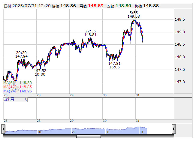 米ドル/円 <5分足> 「株探」多機能チャートより31日午前の東京市場でドル・円は軟調地合いとなり、149円46銭から148円59銭まで値を下げた。日銀は金融政策決定会合で予想通り政策金利の据え置きを決定。ドル・円はすでに149円台に浮上しており、節目の150円を意識した売りが強まった。