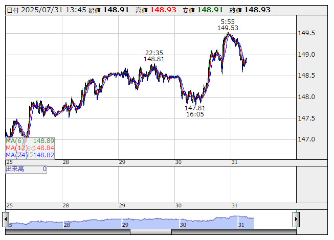米ドル/円 <5分足> 「株探」多機能チャートより31日午後の東京市場でドル・円は小動きとなり、148円90銭付近でのもみ合い。米10年債利回りは前日からの低下でドル買いは入りづらく、ユーロ・ドルは下げ渋る展開に。一方、日経平均株価は堅調地合いを強め、株高を好感した円売りが続く。