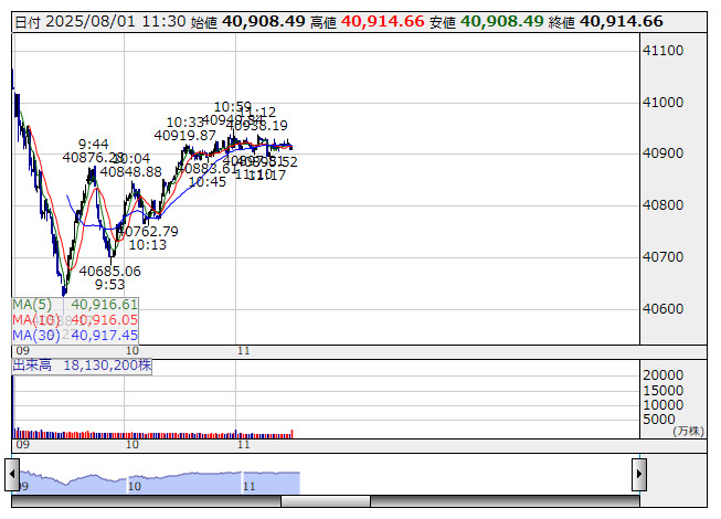 日経平均 <1分足> 「株探」多機能チャートより日経平均株価は反落。前日の米株式市場は、NYダウは330ドル安と下落。物価関連指標の発表を受け、米国の利下げ期待が後退したことが警戒された。米国株が下落した流れを受け、日経平均株価は軟調にスタートした。特に、前日に26年3月期の業績予想を下方修正した東京エレクトロン<8035>が一時ストップ安と急落したことが響き、日経平均株価は午前9時20分過ぎに一時480円を超える下落となった。ただ、売り一巡後は下げ渋り日経平均株価の下げ幅は縮小した。東エレクの1銘柄で日経平均株価を470円押し下げるなど半導体関連株が安い。ただ、内需関連株などは堅調で東証33業種のうち29業種は上昇しており、TOPIXは値を上げている。