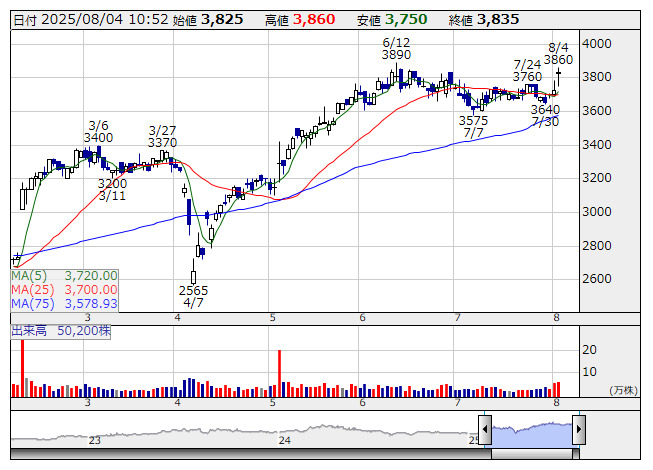 7609>が3連騰。同社は前週末1日の取引終了後、25年12月期第2四半期累計(1~6月)の連結決算を発表。売上高は前年同期比9.1%増の488億5200万円、最終利益は同35.6%増の25億5500万円となった。大幅な増益でかつ会社計画に対して上振れして着地し、ポジティブ視されたようだ。海外事業の売り上げが前倒しで計上され、中間期の業績の押し上げに寄与した。国内ではアナログICや電源機器などの販売が減少した一方、半導体製造装置向けのコネクターや車載向け画像関連機器・部品のレンズ、データセンター用のUPSシステムなどが堅調に推移した。
