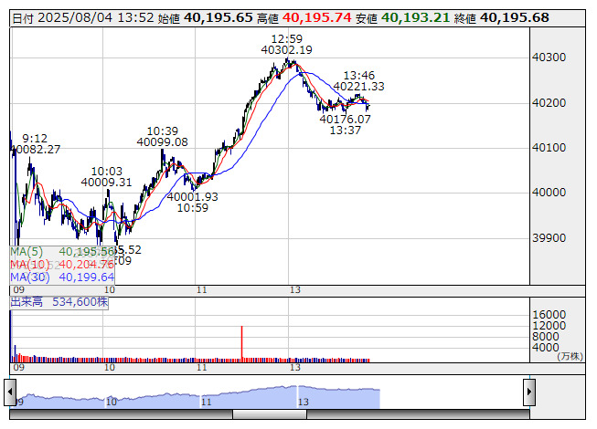 日経平均 <1分足> 「株探」多機能チャートより日経平均は598円安(13時50分現在)。日経平均寄与度では、ファーストリテ<9983>、TDK<6762>、リクルートHD<6098>などがマイナス寄与上位となっており、一方、任天堂<7974>、HOYA<7741>、東エレク<8035>などがプラス寄与上位となっている。セクターでは、銀行業、保険業、サービス業、鉱業、石油石炭製品が値下がり率上位、その他製品、空運業、不動産業、精密機器、食料品が値上がり率上位となっている。