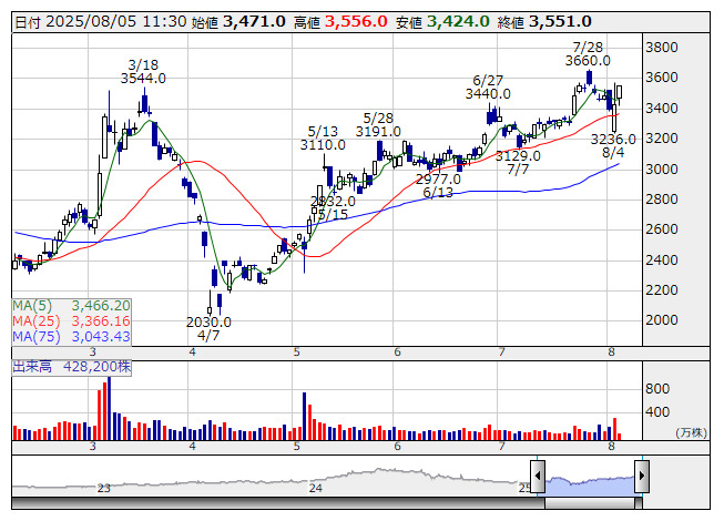DMG森精機 <日足> 「株探」多機能チャートより■財務省 : 8月5日受付