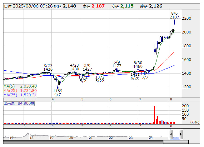 2025年08月06日09時26分 【材料】串カツ田中が大幅6日続伸、7月既存店売上高が9カ月連続前年上回る 串カツ田中 <日足> 「株探」多機能チャートより 串カツ田中ホールディングス<3547>が大幅高で6日続伸し、21年11月以来の高値となっている。5日の取引終了後に発表した7月度の月次報告で、直営店の既存店売上高が前年同月比15.8%増となり、9カ月連続で前年実績を上回ったことが好感されている。 例年と比べ梅雨の影響が少なく天候に恵まれたことで客数が同18.7%増と大幅に増加したことが牽引。また、4月に導入した低価格新商品「無限ニンニクホルモン串」が販売開始から約3カ月で500万本と好評だったことも寄与した。 出所:MINKABU PRESS