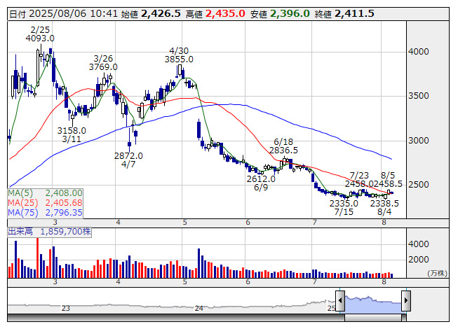 ディーエヌエ <日足> 「株探」多機能チャートより■財務省 : 8月6日受付
