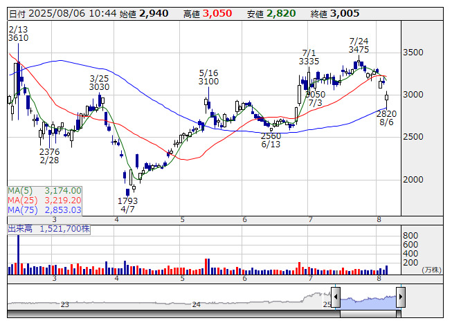 7220>は大幅続落。前日に第1四半期の決算を発表、営業利益は38.1億円で前年同期比4.4%減となった。国内やアジア四輪生産の低下が減益要因だが、ほぼ市場予想線上での着地となった印象。一方、HSCの出荷予定が顧客理由により従来の第3四半期予定から後ろ倒しとされたことは警戒材料につながっているもよう。通期計画は210億円で前期比6.5%増は据え置きだが、過度な上振れ期待はやや低下する状況にもなっているようだ。