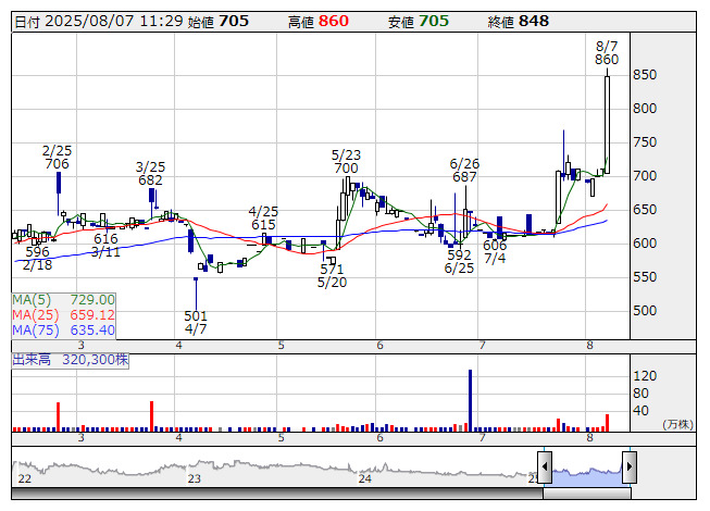 【材料】前場のランキング【寄付からの値上がり率】 (8月7日)