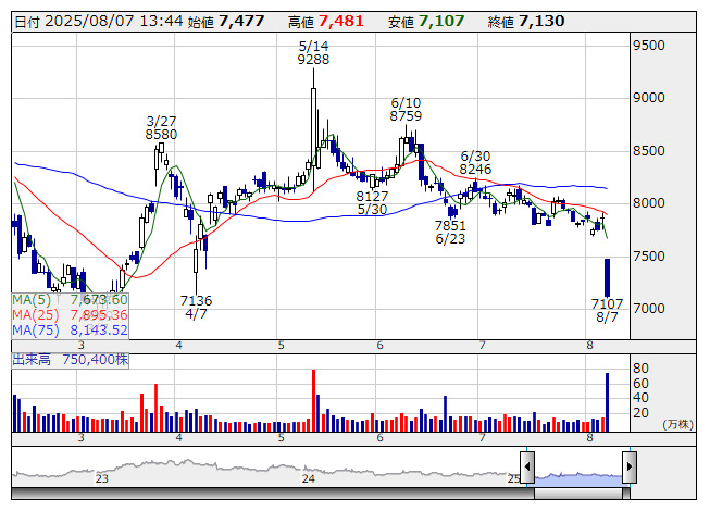2025年08月07日13時44分 【材料】ゴルドウイン---大幅反落、第1四半期減収スタートなどをマイナス視も ゴルドウイン <日足> 「株探」多機能チャートより ゴルドウイン<8111>は大幅反落。前日に第1四半期の決算を発表、営業利益は21億円で前年同期比13.1%増となったが、ほぼコンセンサス水準にとどまっている。据え置きの通期予想は259億円で前期比18.2%増であり、やや進捗の鈍さが警戒される形に。とりわけ、第1四半期売上高は前年同期比2.9%減と低調、高価格帯などが苦戦しているもようであり、先行きへの懸念にもつながっているようだ。 《ST》 提供:フィスコ