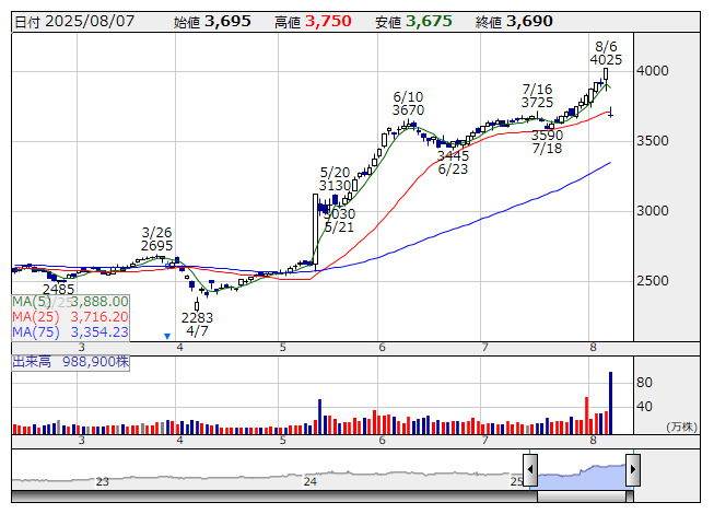 6日ストップ高の買い人気継続。