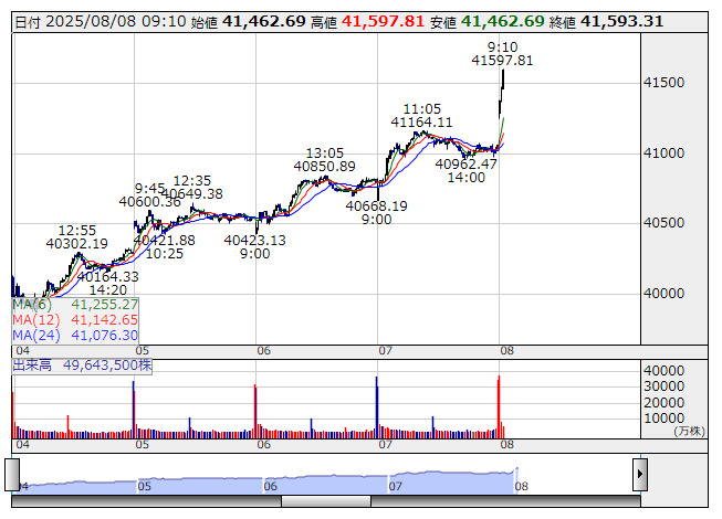 2025年08月08日09時14分 【市況】日経平均の上げ幅が500円突破 日経平均 <5分足> 「株探」多機能チャートより 日経平均株価の上げ幅が500円を突破。9時13分現在、538.66円高の4万1597.81円まで上昇している。 株探ニュース