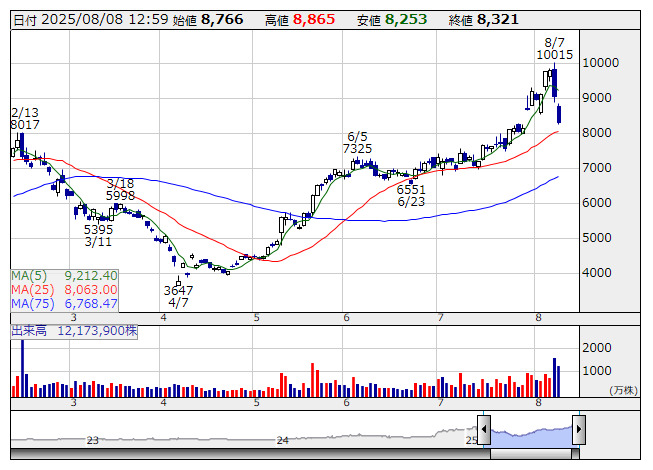 5801>は大幅続落。前日は決算発表後に大きく下落したが、本日も一段安の展開となっている。第1四半期営業利益は84億円で前年同期比2.4倍となったが、据え置きの通期計画に対する進捗率は低水準にとどまる。古河電池の事業譲渡が1四半期ずれ込んだことは20億円程度の増益要因となることで、実質的に通期見通しは小幅に下振れとも受け止められる。AI関連製品の拡大期待が株価に反映されていた中、ネガティブな反応が継続する形に。