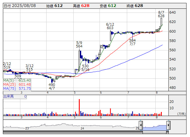 3392>がストップ高の水準となる前営業日比100円高の728円でカイ気配となっている。同社は7日の取引終了後、26年3月期第1四半期(4~6月)の連結決算を発表。売上高は151億5400万円(前年同期比11.4%増)、経常利益は9億5500万円(前年同期は5400万円)となった。経常利益は中間期の計画を超過しており、業績の上振れの可能性が意識され、大量の買い注文が集まった。青果物流通事業を展開するグループのデリカフーズにおいて取引先の拡大を進めたほか、一般消費者向けミールキットを手掛ける楽彩を中心にBtoC事業も拡充。物流子会社では収益性の高い新規取引先を獲得した。調達コストや在庫管理の徹底、廃棄ロスの削減による効果も利益を押し上げる要因となった。