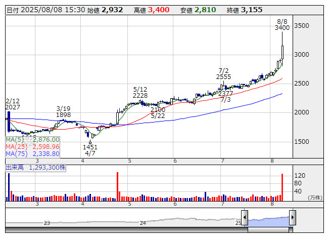 日本電子材料<6855>=大幅高で新高値。同社は7日取引終了後、26年3月期第1四半期(4~6月)の連結決算を発表。営業利益は前年同期比25.0%増の14億7500万円となり、上半期計画の16億5000万円に対する進捗率は89.4%となった。売上高は同8.9%増の54億3700万円で着地。高付加価値製品の売り上げが伸びたほか、国内工場の稼働率や生産効率の向上などが寄与した。なお、上半期及び通期の業績予想については従来計画を据え置いている。