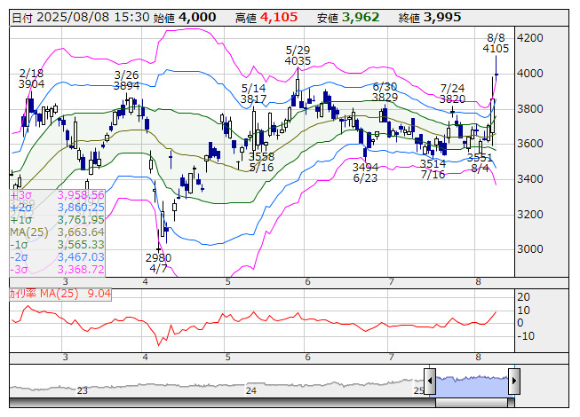 ソニーG <日足> ボリンジャー/カイリ率 「株探」多機能チャートより●株価が+3σを上回った銘柄(市場人気順) ★株価の上げ足が速過ぎ、売りが出やすい銘柄