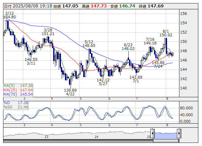 米ドル/円 <日足> Slowストキャス 「株探」多機能チャートより欧州市場でドル・円はじり高となり、147円72銭まで上値を伸ばしている。米10年債利回りの底堅く推移しており、ドルは下げづらい。それを受け、ユーロ・ドルは小幅下落で軟調地合いが続くものの、ユーロ・円は欧州株高を受けた円売りが押し上げる。