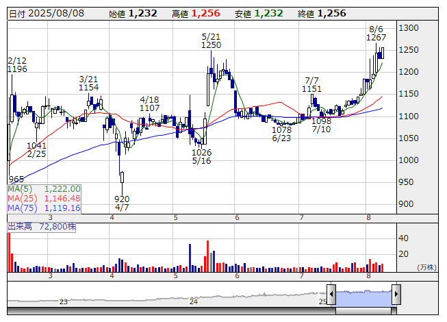 発行済み株式数(自社株を除く)の2.1%にあたる20万株(金額で5億円)を上限に自社株買いを実施する。買い付け期間は8月8日から26年3月24日まで。