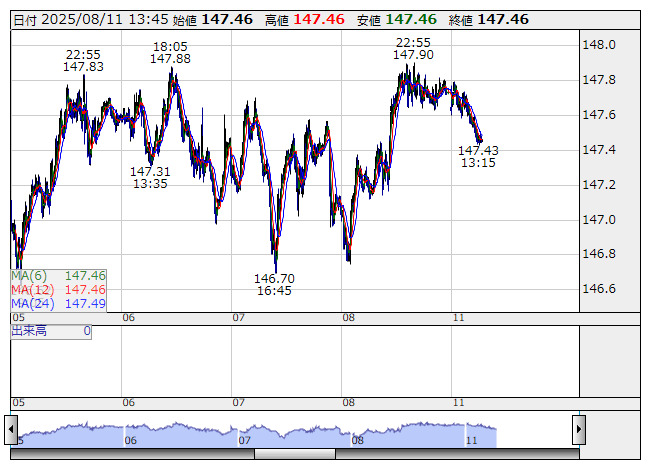 米ドル/円 <5分足> 「株探」多機能チャートより11日午後の東京市場でドル・円は小動きとなり、147円42銭まで下値を切り下げた後は下げ渋る展開に。米10年債利回りの低下は一服し、ドル売りはいったん収束。ただ、ユーロ・ドルは本日高値圏を維持し、ユーロ・円もそれに追随し下げづらい。