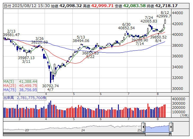 日経平均 <日足> 「株探」多機能チャートより日本取引所が公表した先物手口情報によると、8月12日の日経225ミニ期近(2025年9月限)の夜間取引(立会内・J-NETの合算)で、取引高トップはABNクリアリン証券の30万5681枚だった。