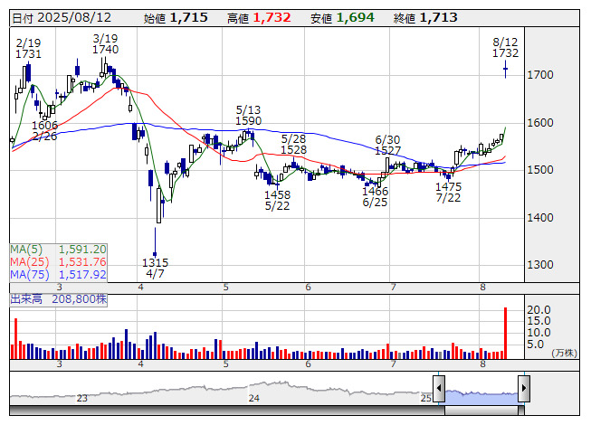 極東貿易 <日足> 「株探」多機能チャートより極東貿易<8093>は8日、2026年3月期第1四半期(25年4月-6月)連結決算を発表した。売上高が前年同期比53.0%増の160.41億円、営業利益が同242.2%増の7.34億円、経常利益が同109.3%増の8.22億円、親会社株主に帰属する四半期純利益が同386.9%増の6.34億円となった。