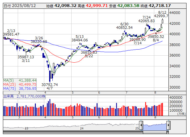 13日の東京株式市場はリスクオンの地合いが続き、日経平均株価は4万3000円台に乗せそうだ。前日に日経平均は終値で900円近い上昇をみせ、4万2700円台まで上値を伸ばし約1年1カ月ぶりに史上最高値を更新したが、きょうも米国株市場の大幅高を受けて買い優勢の流れが続きそうだ。前日の欧州株市場は高安まちまちの展開となり、フランスの主要株価指数であるCAC40は反発したが、独DAXは3日続落と調整局面が続いた。米国と中国の関税政策を巡る貿易交渉が進展することへの期待から朝方は高くスタートしたが、買い一巡後は上値が重くなった。一方、米国株市場では朝方取引開始前に開示された7月の米消費者物価指数(CPI)がおおむね事前コンセンサスに見合った内容で、物価上昇への警戒感が和らいだことから市場センチメントが改善、ハイテクセクターをはじめ幅広い銘柄に買いが優勢だった。米CPIの上昇率は前月比で0.2%上昇と6月からは伸び率が鈍化し、コア指数も0.3%の伸びにとどまり予想と合致した。前年同月比ではコアが3.1%上昇と予想を上回ったが、想定内との受け止め方で全体相場への影響は限られた。FRBが9月に利下げに踏み切るとの見方が強まり、全体相場の上昇を後押ししている。NYダウ、ナスダック総合株価指数ともに大幅に上昇し、ナスダック指数は史上最高値を更新した。また、機関投資家がベンチマークとして重視するS&P500指数も最高値をつけている。東京市場では直近5営業日で日経平均が2400円以上も水準を切り上げており、短期的な過熱感は拭えない。しかし、海外投資家の買いが続くなか足もとで買い優勢の流れは継続しそうだ。外国為替市場で目先やや円高方向に振れていることは輸出セクターには向かい風となり得るが、米株市場のリスクオンが鮮明となるなか、強気に傾いた投資家心理を冷やすには至らないだろう。