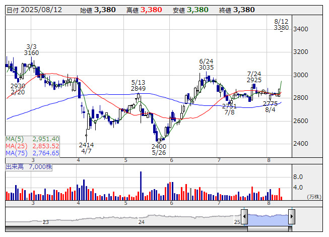 AIメカ <6227> 4,750 +685 (+16.9%) 69,900 ( 33,237) 67,100 ( 31,872)