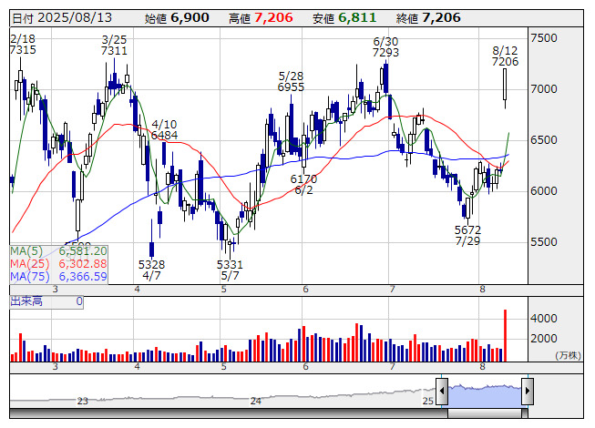 サンリオ <日足> 「株探」多機能チャートより8月13日9時03分38秒現在、特別買い気配は51銘柄、特別売り気配は39銘柄となっている。