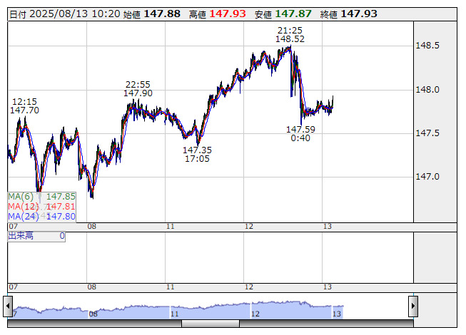 ベッセント米財務長官が12日に「米連邦準備理事会(FRB)は9月の次回会合で0.5%の利下げを検討するべき」との考えを示したこともあり、この日の東京市場もドル売り・円買いが先行した。日経平均株価が続伸して始まったことを手掛かりに147円89銭まで下げ渋る場面もあったが、ドル買い・円売りは続かず147円70銭台に押し戻された。