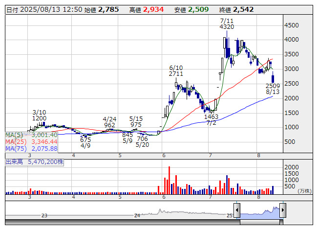 大幅に続落。新株予約権に係る発行登録書を関東財務局長に提出したと発表している。発行予定額の上限は780億円で、発行予定期間は20日から26年8月19日まで。割当予定先は筆頭株主であるシンガポールのFirst Plus社。調達資金はAIデータセンター事業での設備投資資金及び運転資金等に充当する予定。新株予約権の発行は将来的な株式価値を希薄化させる可能性があるとの懸念から、売り優勢となっているようだ。