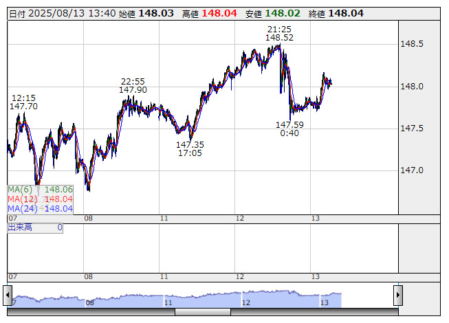 米ドル/円 <5分足> 「株探」多機能チャートより13日午後の東京市場でドル・円は小動きとなり、148円付近でのもみ合いが続く。日経平均株価の強含みのほか、上海総合指数などアジアの主要指数も堅調で、リスク選好の円売りに振れやすい。一方、米長期金利はほぼ横ばいで、ドル買いは入りづらい。