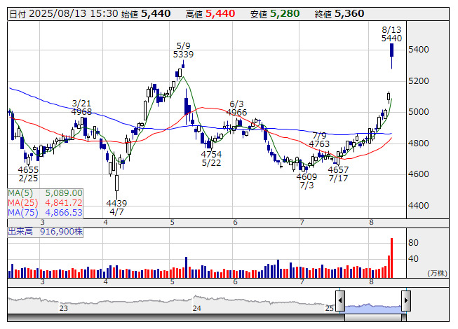 ショーボンド <日足> 「株探」多機能チャートより<1414> ショーボンド 5360 +237
