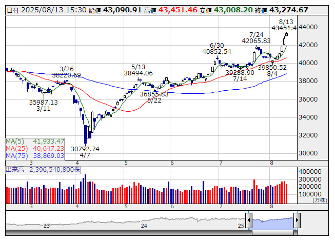 日経平均 <日足> 「株探」多機能チャートより日本取引所が公表した先物手口情報によると、8月13日の日経225ミニ期近(2025年9月限)の夜間取引(立会内・J-NETの合算)で、取引高トップはABNクリアリン証券の16万8079枚だった。
