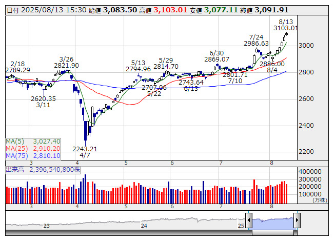 TOPIX <日足> 「株探」多機能チャートより日本取引所が公表した先物手口情報によると、8月13日のTOPIX先物期近(2025年9月限)の夜間取引(立会内・J-NETの合算)で、取引高トップはABNクリアリン証券の1万4063枚だった。