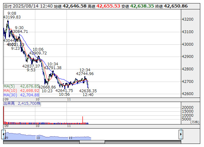 日経平均は反落。548.04円安の42726.63円(出来高概算10億7707万株)で前場の取引を終えている。