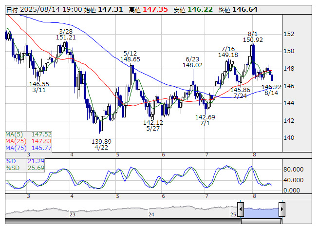 2025年08月14日19時01分 【通貨】外為:1ドル146円62銭前後と小幅なドル高・円安で推移 米ドル/円 <日足> Slowストキャス 「株探」多機能チャートより 14日の外国為替市場のドル円相場は午後7時時点で1ドル=146円62銭前後と、午後5時時点に比べ6銭の小幅なドル高・円安。ユーロ円は1ユーロ=171円30銭前後と12銭のユーロ高・円安で推移している。 株探ニュース
