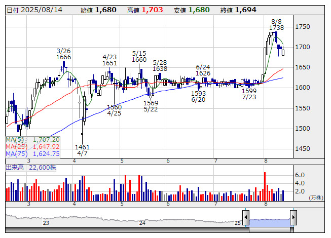 2025年08月15日08時38分 【テク】アミューズ---過熱感後退で再動意へ アミューズ <日足> 「株探」多機能チャートより <4301> アミューズ - - 7月末からの強い上昇局面でボリンジャーバンドの+3σを突破し、8日につけた1738円をピークに調整をみせていた。直近の下げで+1σを下回ってきており、過熱感は後退している。一目均衡表では雲を上放れての推移であるが、直近の調整では転換線、基準線が支持線として機能しており、再動意のタイミングに。 《FA》 提供:フィスコ