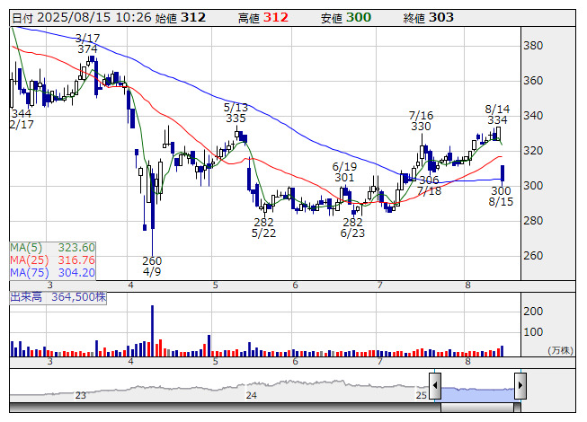 まんだらけ <日足> 「株探」多機能チャートより15日の東京市場で、まんだらけは反落。14日取引終了後に発表した25年9月期第3四半期累計(24年10月~25年6月)の単独決算がネガティブ視されているようだ。