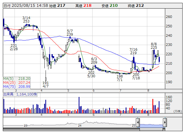 RIZAP <日足> 「株探」多機能チャートよりRIZAPグループ<2928>は14日、2026年3月期第1四半期(25年4月-6月)連結決算(IFRS)を発表した。売上収益が前年同期比1.3%減の399.15億円、営業利益が4.08億円(前年同期は28.84億円の損失)、税引前損失が1.66億円(同36.91億円の損失)、親会社の所有者に帰属する四半期損失が59.45億円(同28.53億円の損失)となった。なお、親会社の所有者に帰属する四半期損失については、2025年5月15日付で開示したRIZAP株式会社に対する債権放棄の影響で、合計58.78億円の一過性のマイナス影響を受けており、この影響は当期の業績予想に反映済であり、事業の実態や収益力には影響ない。