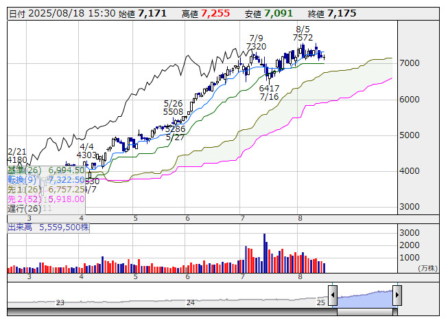 良品計画 <日足> 一目均衡表 「株探」多機能チャートより●一目均衡表【3役好転】銘柄(市場人気順) ★強い上昇トレンドに入った可能性が高い銘柄