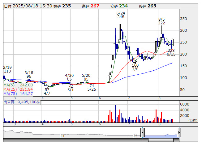モンラボ <日足> 「株探」多機能チャートより<5255> モンラボ 265 +39