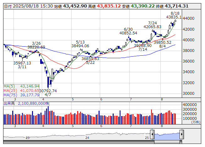 日経平均 <日足> 「株探」多機能チャートより日本取引所が公表した先物手口情報によると、8月18日の日経225ミニ期近(2025年9月限)の日中取引(立会内・J-NETの合算)で、取引高トップはABNクリアリン証券の23万6411枚だった。