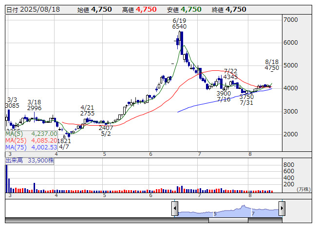 フライングG <3317> 3,125 +499 (+19.0%) 7,800 ( 2,441) 6,500 ( 2,031)