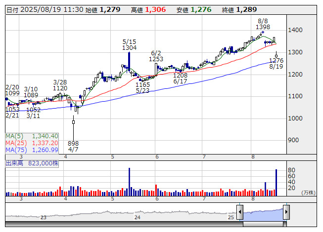 急伸。東証スタンダードから東証プライムへ上場市場区分を変更することとなったと発表した。これに伴い、25年9月末に記念配当5円を実施すると発表している。期末配当は23円(前期期末配当18円)となる。また、230万4400株上限の株式売出し、34万5600株上限のオーバーアロットメントによる売出しも実施する。
