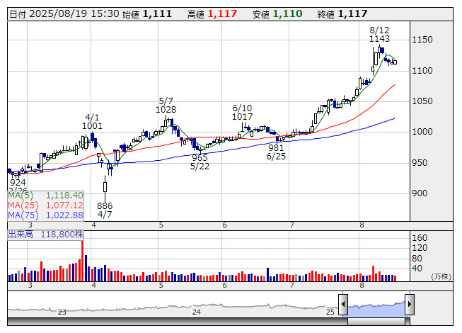TOKAI <日足> 「株探」多機能チャートより同時に、上限を220万株(自己株式を除く発行済み株数の1.67%)、または20億円とする自社株買いを実施すると発表した。取得期間は売り出しの受渡期日の翌営業日から来年3月31日までで、株式の売り出し実施に伴う株式需給への影響を緩和するのが狙い。また、将来の希薄化懸念を払拭するため、取得した全自社株は消却する。