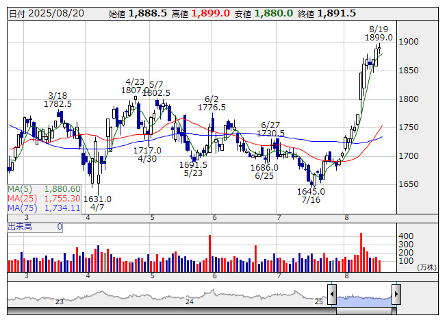 東急 <日足> 「株探」多機能チャートより8月20日9時03分36秒現在、特別買い気配は25銘柄、特別売り気配は15銘柄となっている。