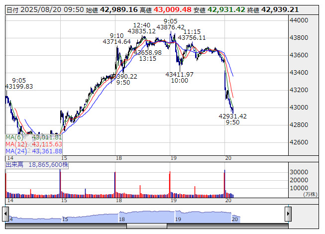 2025年08月20日09時55分 【市況】日経平均の下げ幅が600円を超える 日経平均 <5分足> 「株探」多機能チャートより 日経平均株価の下げ幅が600円を超えた。9時54分現在、614.87円安の4万2931.42円まで下落している。 株探ニュース