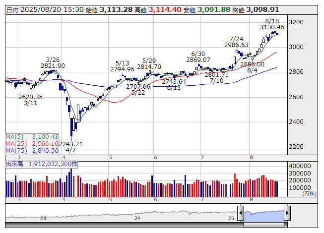 TOPIX <日足> 「株探」多機能チャートより日本取引所が公表した先物手口情報によると、8月20日のTOPIX先物期近(2025年9月限)の日中取引(立会内・J-NETの合算)で、取引高トップはABNクリアリン証券の2万6487枚だった。