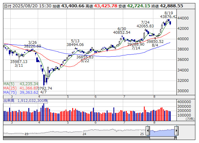 日経平均 <日足> 「株探」多機能チャートより日本取引所が公表した先物手口情報によると、8月20日の日経225先物期近(2025年9月限)の日中取引(立会内・J-NETの合算)で、取引高トップはABNクリアリン証券の2万9649枚だった。